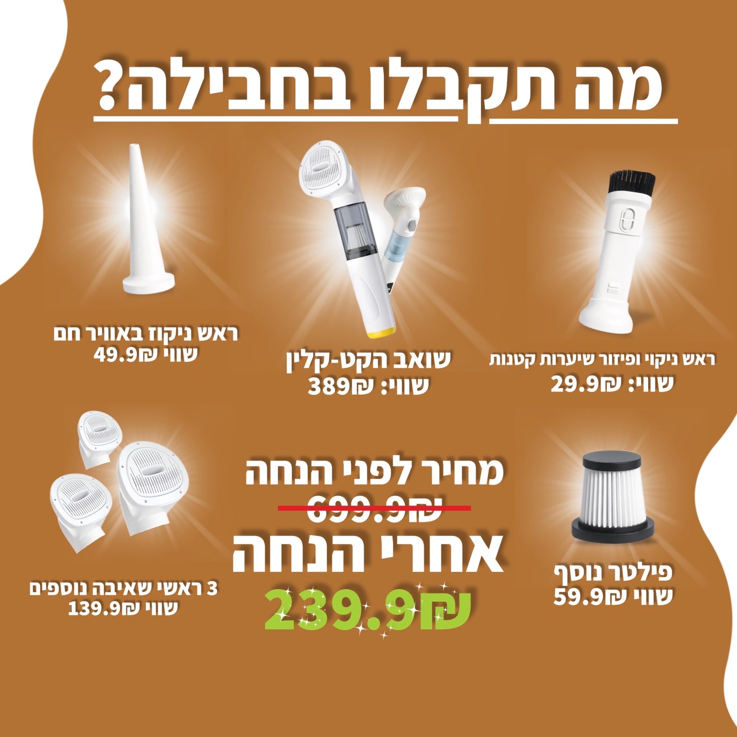 חבילת שואב הקט-קלין נותנת לכם פתרון טיפוח מלא במקום אחד – לנוחות מקסימלית ולשמירה על חתול נקי, רגוע ומטופח.