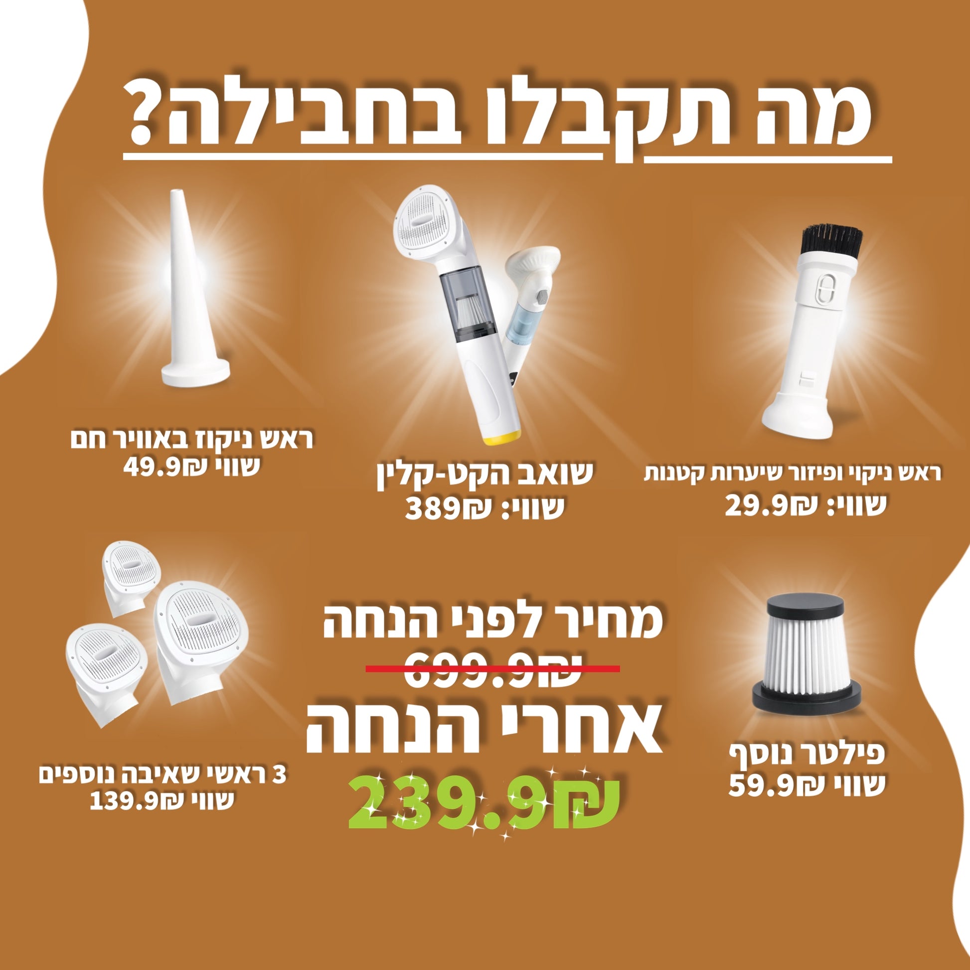מכשיר שואב הקט-קלין הראשי עם מנוע שקט ועיצוב נוח לאחיזה, המאפשר שאיבת פרווה בצורה רגועה ונעימה לחתול. בנוסף תקבלו מספר ראשים מתחלפים להתאמה מלאה לכל צורך: