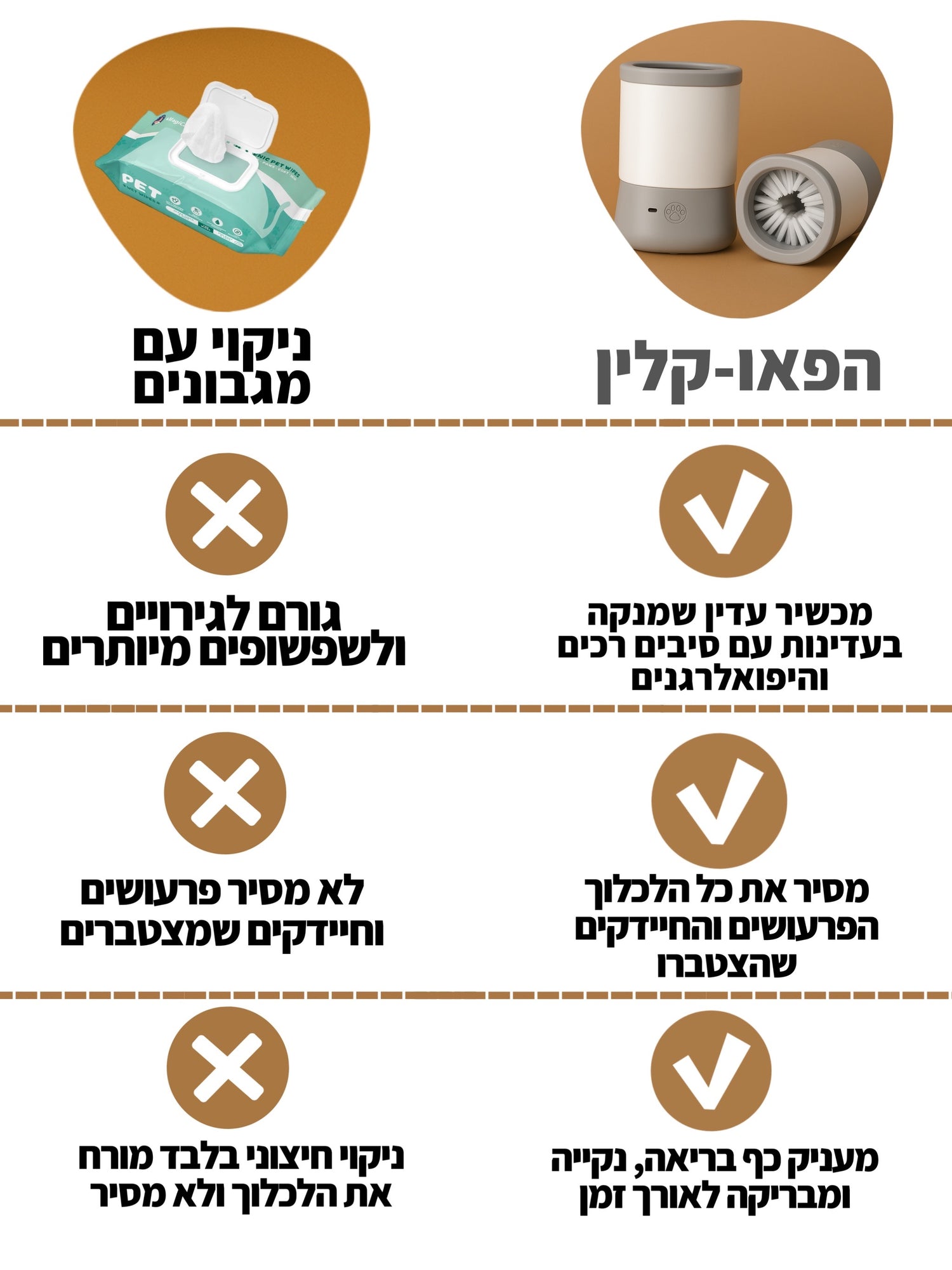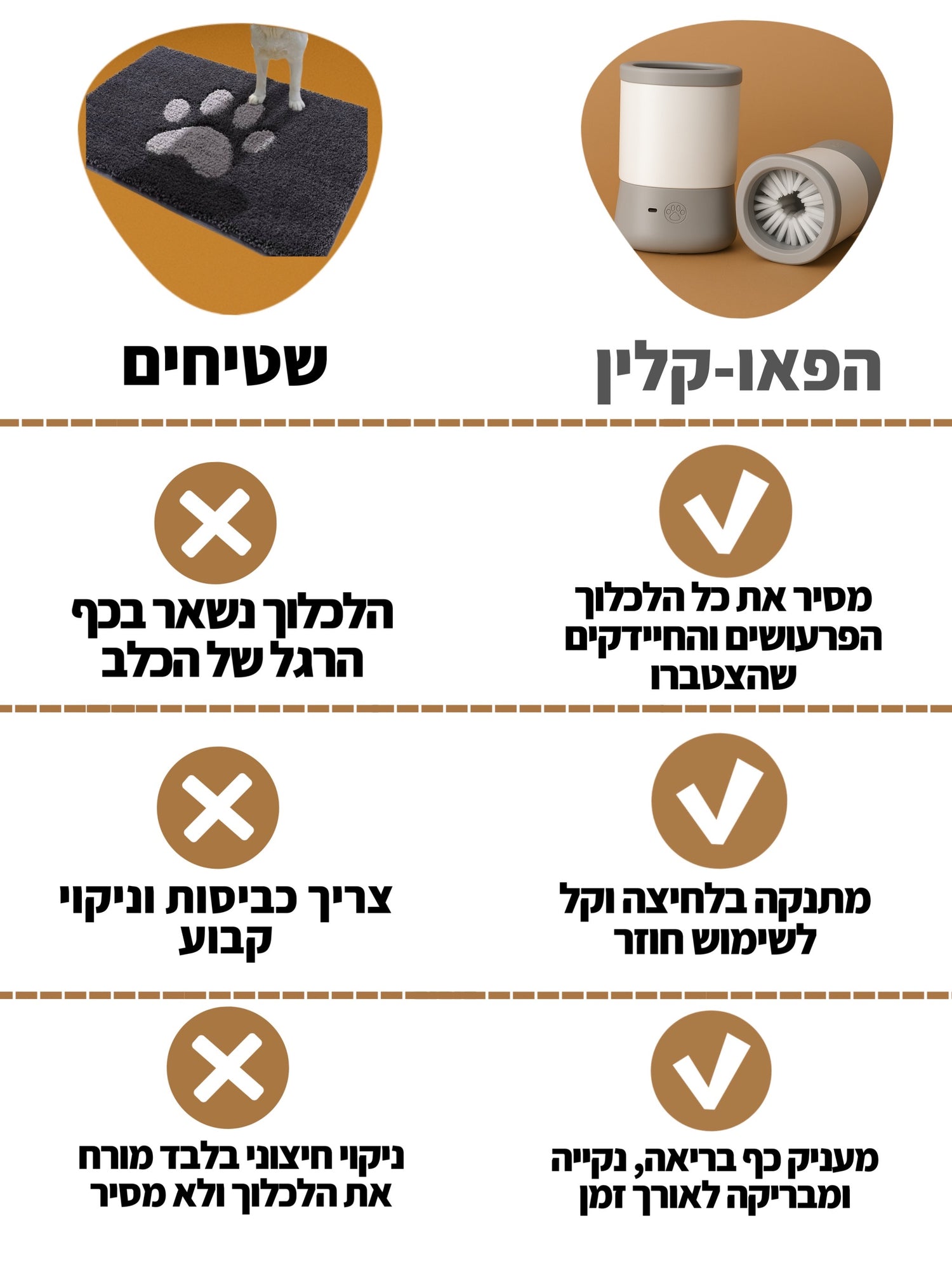 הפאו-קלין פותח במיוחד כדי לשמור על כפות הרגליים של הכלב נקיות ובריאות, בלי בלגן ובלי סטרס. בזכות הסיליקון הרך שמנקה בעדינות כל לכלוך ובוץ, והעיצוב הנייד שמתאים לכל גודל של כלב – אפשר סוף סוף לנקות אחרי כל טיול בקלות ובמהירות. זהו הפתרון שהוטרינרים ממליצים עליו. כפות נקיות פירושן פחות חיידקים בבית ופחות גירויים לעור של הכלב.