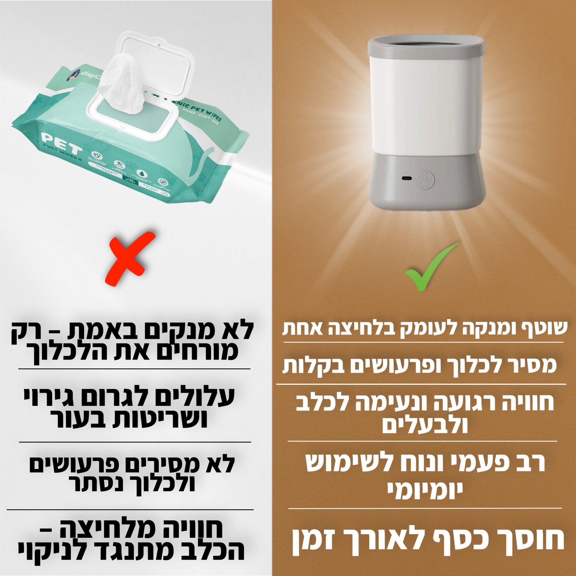 אין צורך בהרכבות או חלקים נוספים – פשוט מוסיפים מים, מכניסים את הכפה, לוחצים – והכלב נקי!