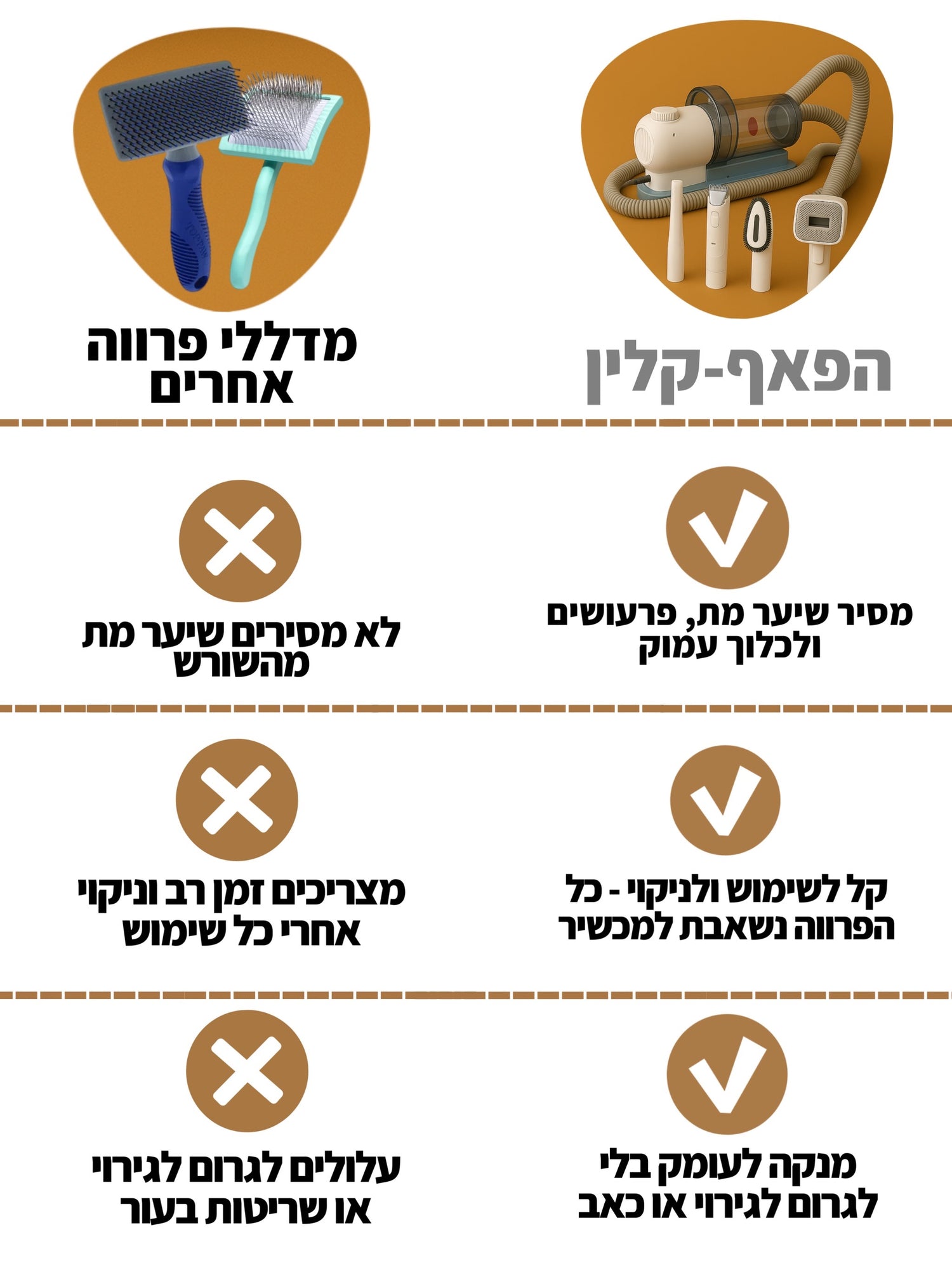 בעוד שמברשות רגילות או מכשירים פשוטים מטפלים רק בשכבה החיצונית של הפרווה, הפאף-קלין מנקה לעומק, שואב שיער מת, מסיר לכלוך ופרעושים, ומחדש את מראה הפרווה באופן מיידי.