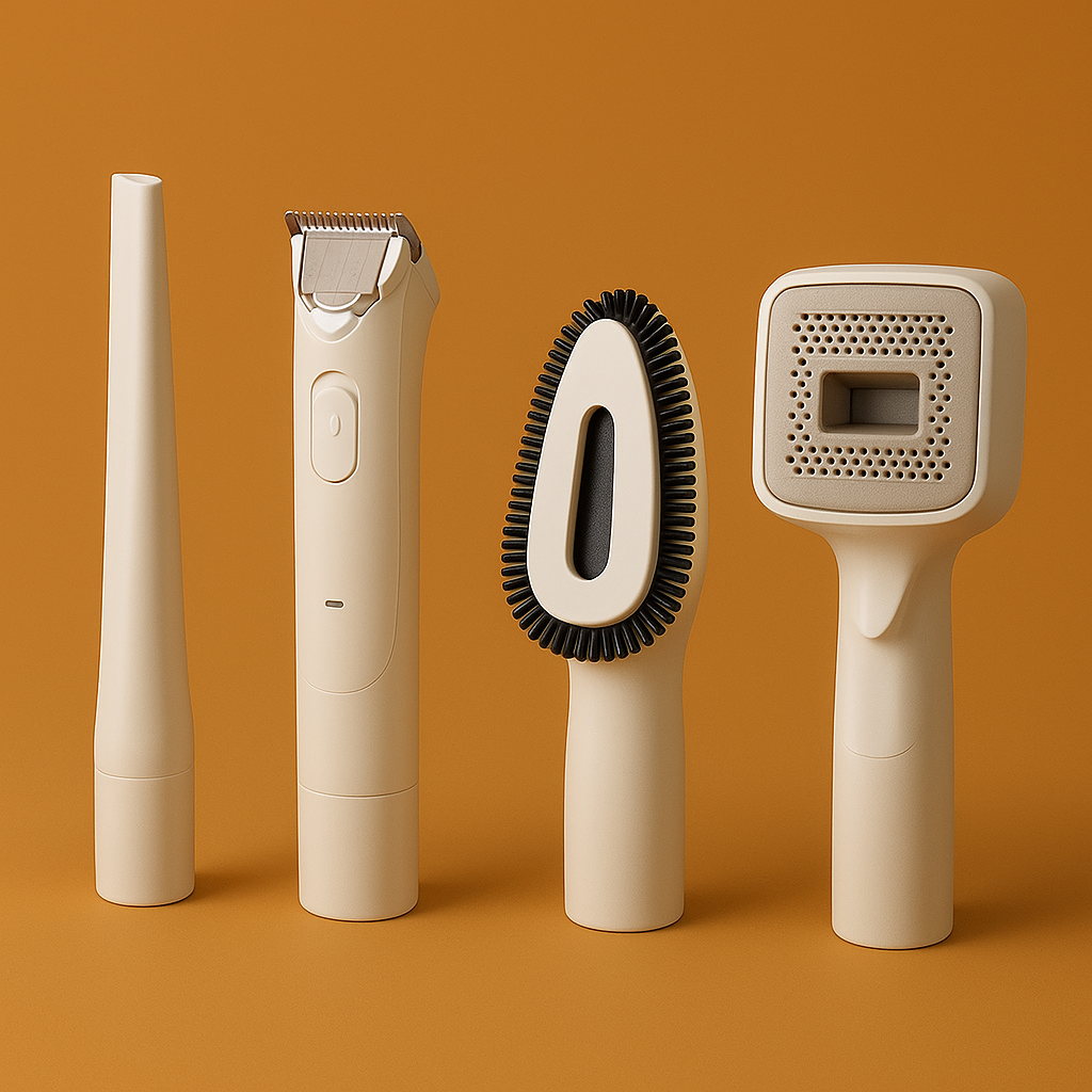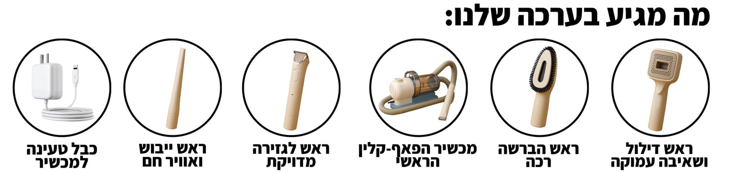 הודות לטכנולוגיית השאיבה השקטה ולראשים המתחלפים, הערכה מאפשרת טיפול מלא – הברשה, גזירה, ניקוי וייבוש – מבלי להלחיץ את הכלב ובלי לפגוע בעור העדין שלו.